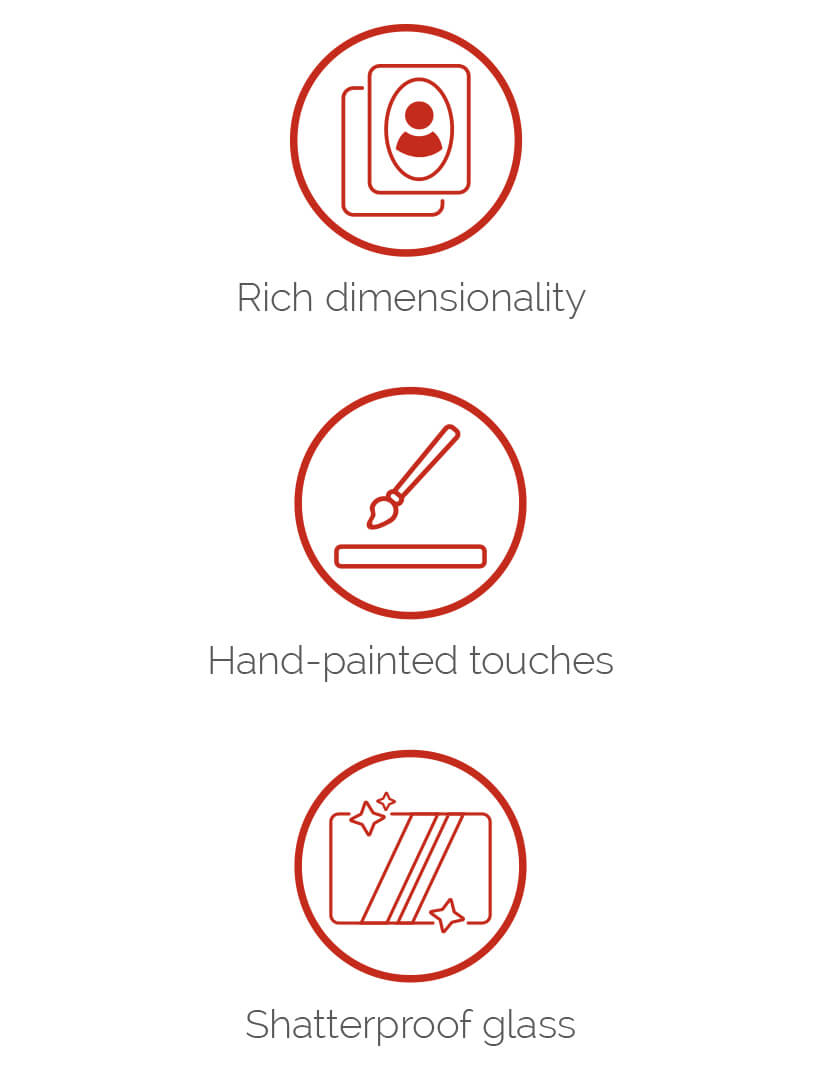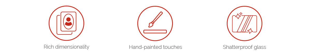 Your Master Composite, the final product, may include as few as 4 portraits or as many as 300+. Finished dimensions depend on the number of individuals. A Master Composite is not merely a flat photo print. At FCS, all our Master Composites are hand-crafted using rich dimensionality by layering molded mortise shapes to create an heirloom-quality keepsake of your group. Your group's unique style and spirit can be expressed through hand-painted embellishments like crests, seals, banners, flowers, athletic logos, and other touches. Our Design Catalog presents our broad selection of quality mattes, frames, and UV blocking, shatterproof glass to complete and protect the keepsake quality of your Master Composite.